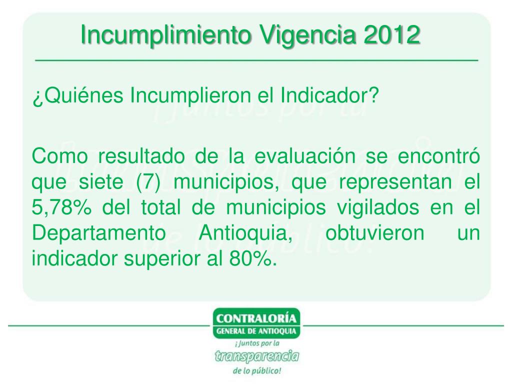 Incumplimiento Vigencia 2012 ¿Quiénes Incumplieron el Indicador? Como resultado de la evaluación se encontró que siete (7) municipios, que representan el 5,78% del total de municipios vigilados en el Departamento Antioquia, obtuvieron un indicador superior al 80%.