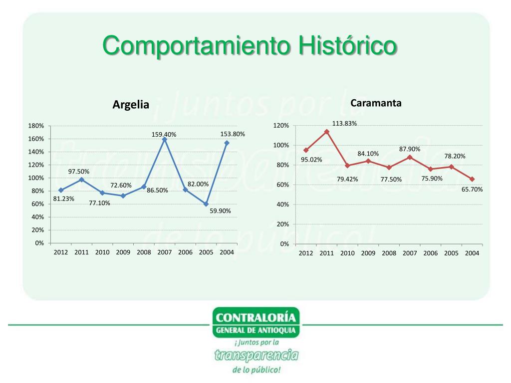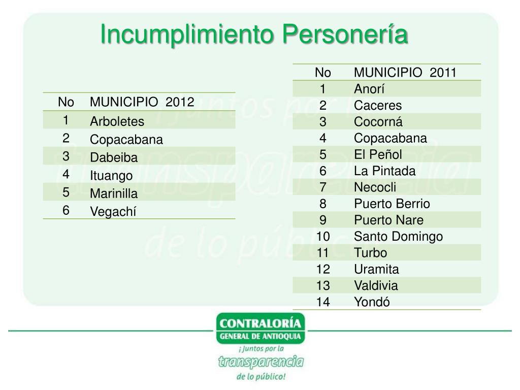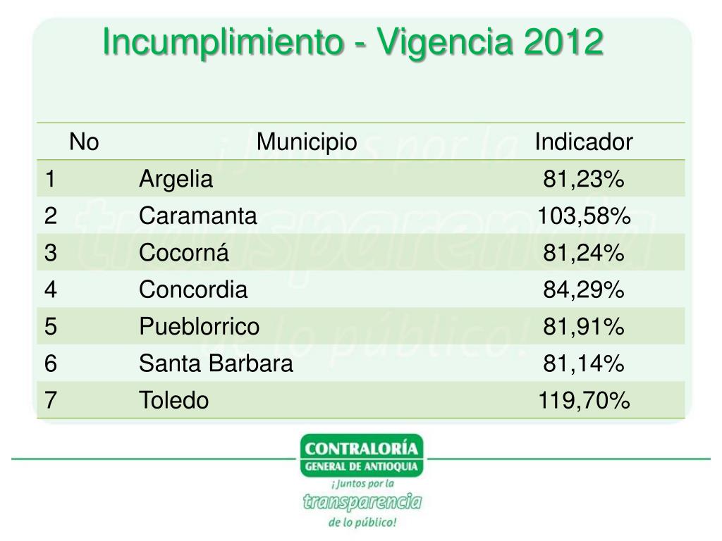 Incumplimiento Municipios • Dos (2) Vigencias: • Argelia, Caramanta, Pueblorrico y Toledo. • Tres (3) Vigencias: • Pueblorrico y Toledo. • Cuatro (4) Vigencias o más: • Pueblorrico y Toledo.
