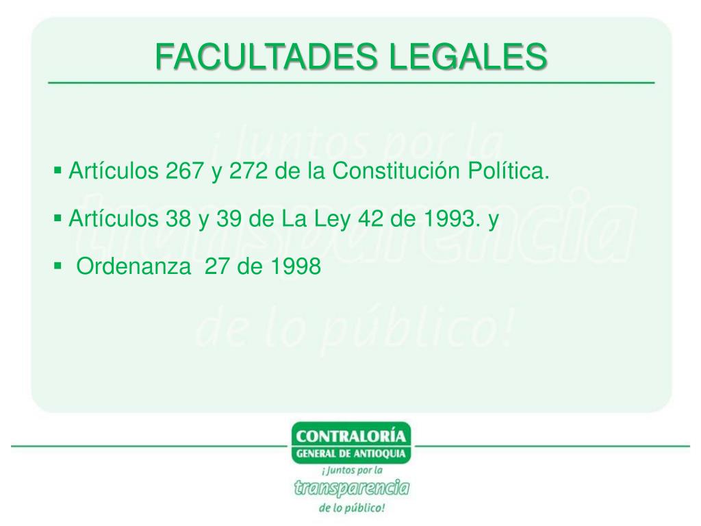 FACULTADES LEGALES • Artículos 267 y 272 de la Constitución Política. • Artículos 38 y 39 de La Ley 42 de 1993. y • Ordenanza 27 de 1998