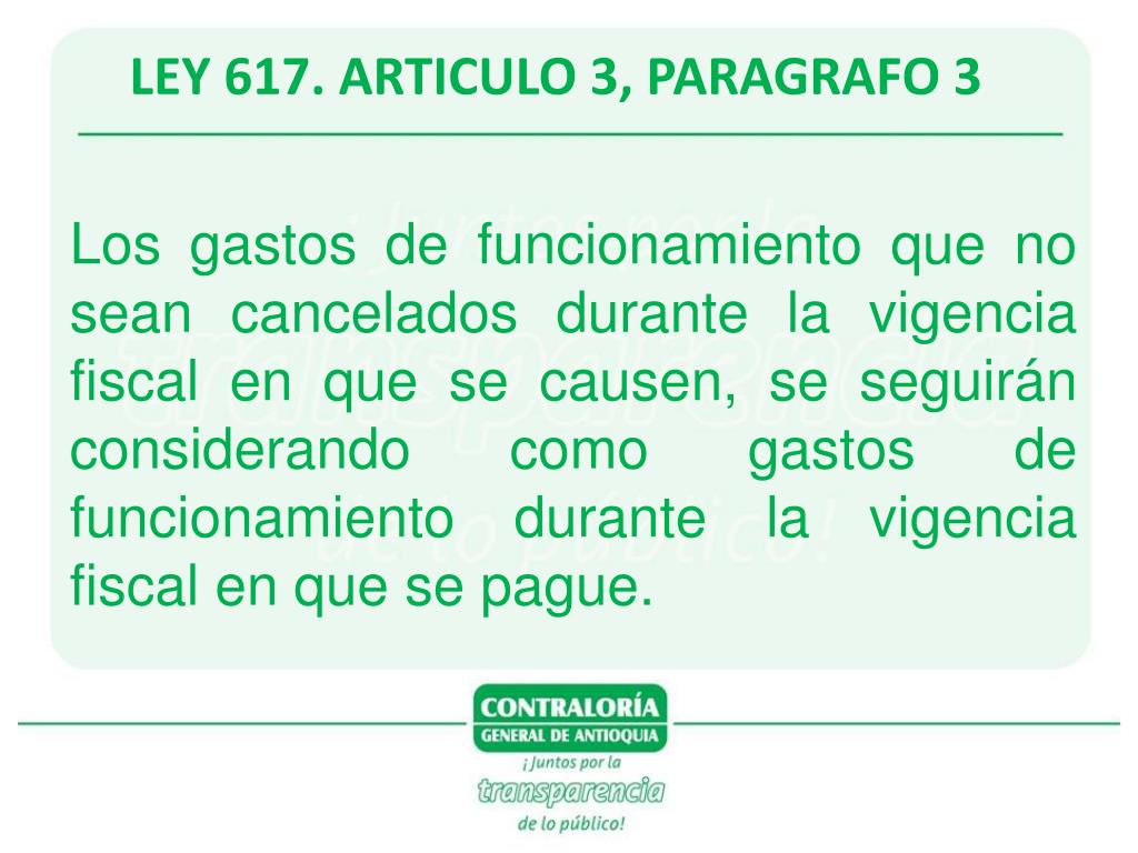 LEY 617. ARTICULO 3, PARAGRAFO 3 Los gastos de funcionamiento que no sean cancelados durante la vigencia fiscal en que se causen, se seguirán considerando como gastos de funcionamiento durante la vigencia fiscal en que se pague.