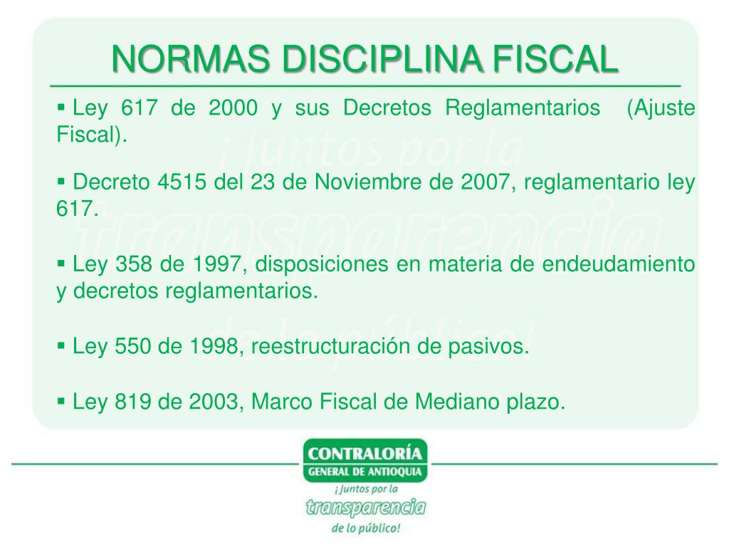 NORMAS DISCIPLINA FISCAL Ley 617 de 2000 y sus Decretos Reglamentarios (Ajuste Fiscal). Decreto 4515 del 23 de Noviembre de 2007, reglamentario ley 617. Ley 358 de 1997, disposiciones en materia de endeudamiento y decretos reglamentarios. Ley 550 de 1998, reestructuración de pasivos. Ley 819 de 2003, Marco Fiscal de Mediano plazo.