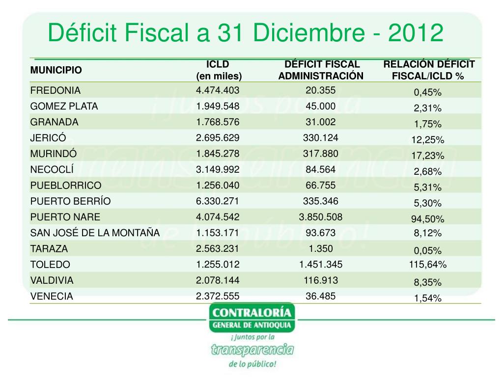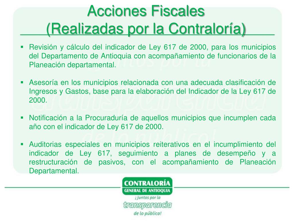 Acciones Fiscales • (Realizadas por la Contraloría) • Revisión y cálculo del indicador de Ley 617 de 2000, para los municipios del Departamento de Antioquia con acompañamiento de funcionarios de la Planeación departamental. • Asesoría en los municipios relacionada con una adecuada clasificación de Ingresos y Gastos, base para la elaboración del Indicador de la Ley 617 de 2000. • Notificación a la Procuraduría de aquellos municipios que incumplen cada año con el indicador de Ley 617 de 2000. • Auditorias especiales en municipios reiterativos en el incumplimiento del indicador de Ley 617, seguimiento a planes de desempeño y a restructuración de pasivos, con el acompañamiento de Planeación Departamental.