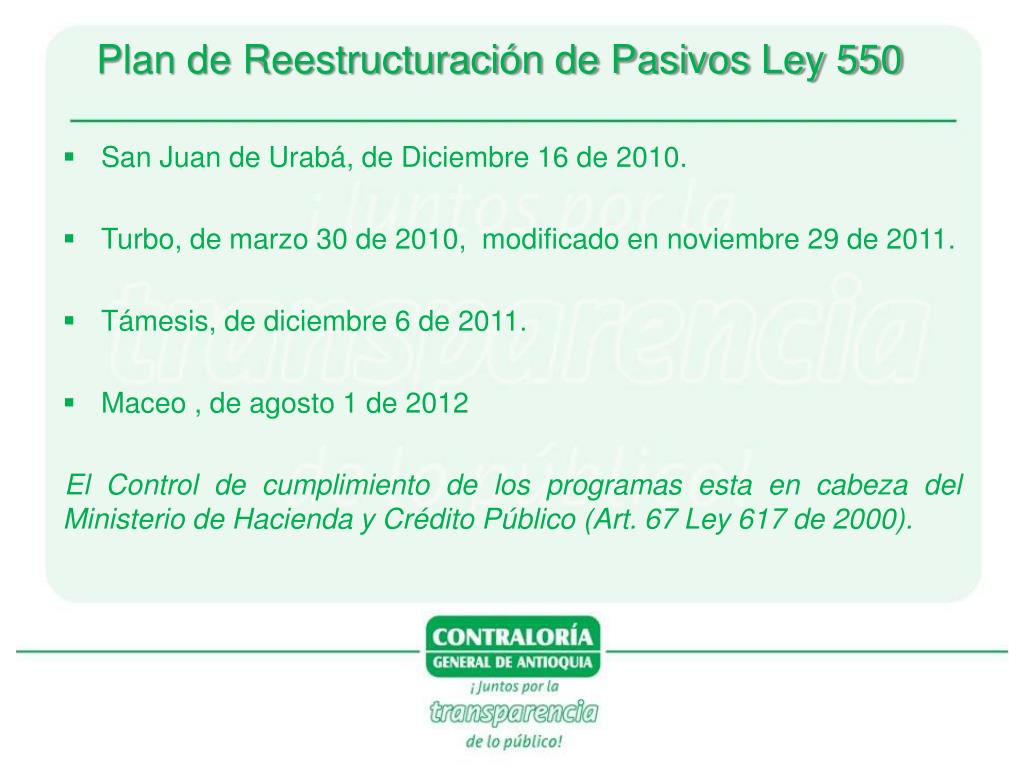Plan de Reestructuración de Pasivos Ley 550 • San Juan de Urabá, de Diciembre 16 de 2010. • Turbo, de marzo 30 de 2010, modificado en noviembre 29 de 2011. • Támesis, de diciembre 6 de 2011. • Maceo , de agosto 1 de 2012 • El Control de cumplimiento de los programas esta en cabeza del Ministerio de Hacienda y Crédito Público (Art. 67 Ley 617 de 2000).