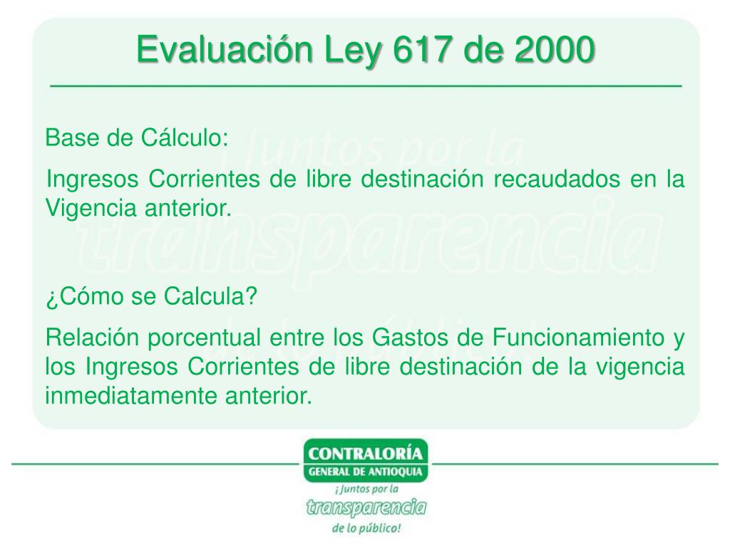 Evaluación Ley 617 de 2000 Base de Cálculo: Ingresos Corrientes de libre destinación recaudados en la Vigencia anterior. ¿Cómo se Calcula? Relación porcentual entre los Gastos de Funcionamiento y los Ingresos Corrientes de libre destinación de la vigencia inmediatamente anterior.