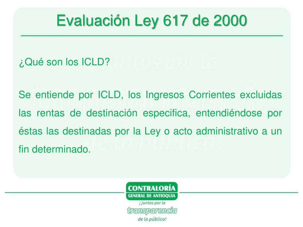Evaluación Ley 617 de 2000 ¿Qué son los ICLD? Se entiende por ICLD, los Ingresos Corrientes excluidas las rentas de destinación especifica, entendiéndose por éstas las destinadas por la Ley o acto administrativo a un fin determinado.