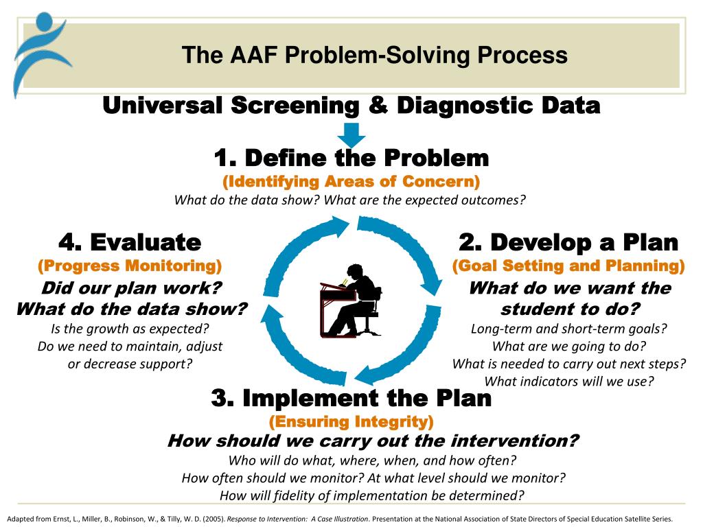 The AAF Problem-Solving Process Universal Screening & Diagnostic Data 1. Define the Problem (Identifying Areas of Concern) What do the data show? What are the expected outcomes? 4. Evaluate (Progress Monitoring) 2. Develop a Plan (Goal Setting and Planning) Did our plan work? What do the data show? Is the growth as expected? Do we need to maintain, adjust or decrease support? What do we want the student to do? Long-term and short-term goals? What are we going to do? What is needed to carry out next steps? What indicators will we use? 3. Implement the Plan (Ensuring Integrity) How should we carry out the intervention? Who will do what, where, when, and how often? How often should we monitor? At what level should we monitor? How will fidelity of implementation be determined? Adapted from Ernst, L., Miller, B., Robinson, W., & Tilly, W. D. (2005). Response to Intervention: A Case Illustration. Presentation at the National Association of State Directors of Special Education Satellite Series.