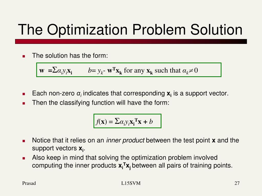 Solving the Optimization Problem Find w and b such that Φ(w) =½ wTw is minimized; and for all {(xi,yi)}: yi (wTxi+ b)≥ 1 • This is now optimizing a quadratic function subject to linear constraints • Quadratic optimization problems are a well-known class of mathematical programming problems, and many (rather intricate) algorithms exist for solving them • The solution involves constructing a dual problem where a Lagrange multiplierαi is associated with every constraint in the primary problem: Find α1…αNsuch that Q(α) =Σαi- ½ΣΣαiαjyiyjxiTxjis maximized and (1)Σαiyi= 0 (2) αi≥ 0 for all αi