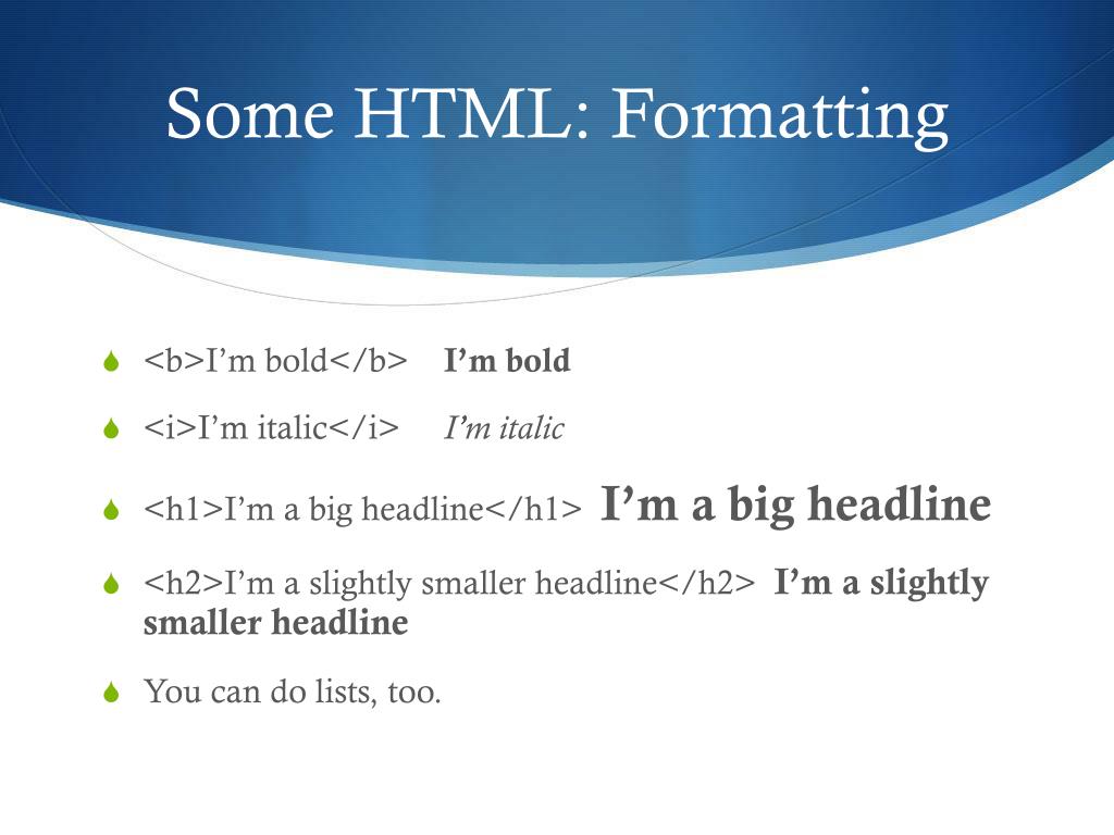 Some HTML: Formatting • <b>I’m bold</b> I’m bold • <i>I’m italic</i> I’m italic • <h1>I’m a big headline</h1> I’m a big headline • <h2>I’m a slightly smaller headline</h2> I’m a slightly smaller headline • You can do lists, too.