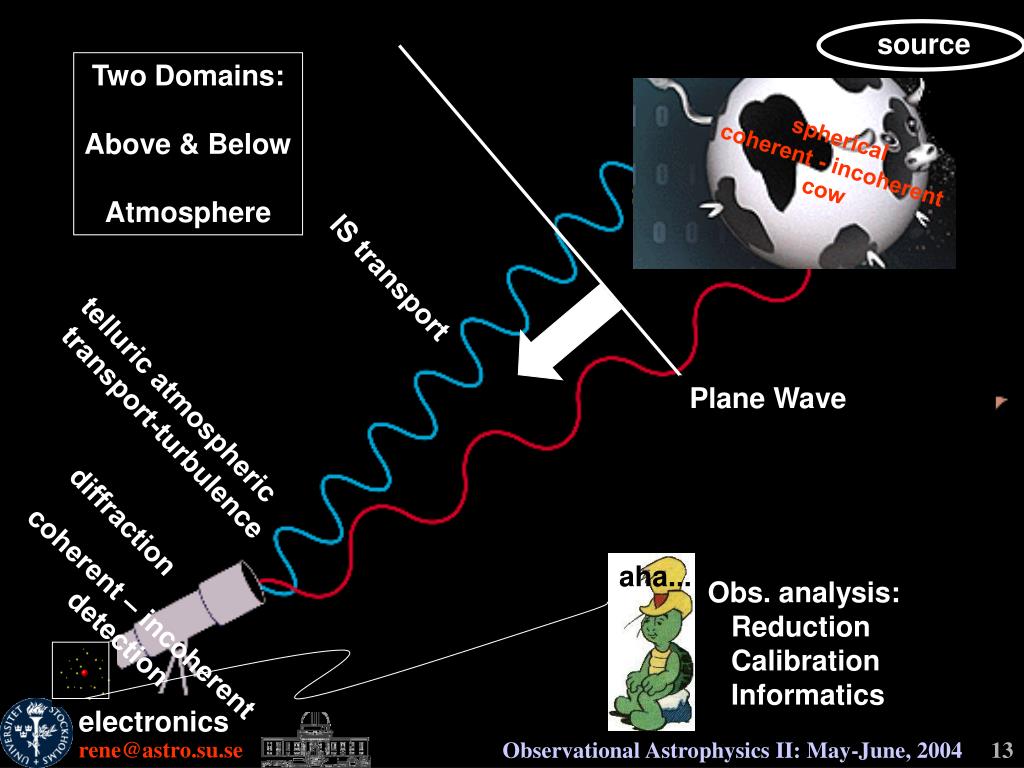 source Two Domains: Above & Below Atmosphere spherical coherent - incoherent cow IS transport Plane Wave telluric atmospheric transport-turbulence diffraction aha... Obs. analysis: Reduction Calibration Informatics coherent – incoherent detection electronics Observational Astrophysics II: May-June, 2004