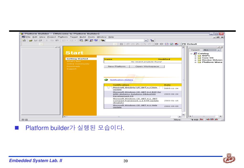Platform builder .NET 4.2 • MS Windows CE .Net 플랫폼을 개발하는 프로그램이다. • Visual studio같은 통합 개발환경을 제공한다. • Windows CE .NET플랫폼을 디자인, 작성, 빌드, 테스트 및 디버깅하는데 필요한 모든 개발 도구가 포함되어 있다. • 상용 프로그램이고 120일 Evaluation version은 MS사에서 무료로 받을 수 있다.