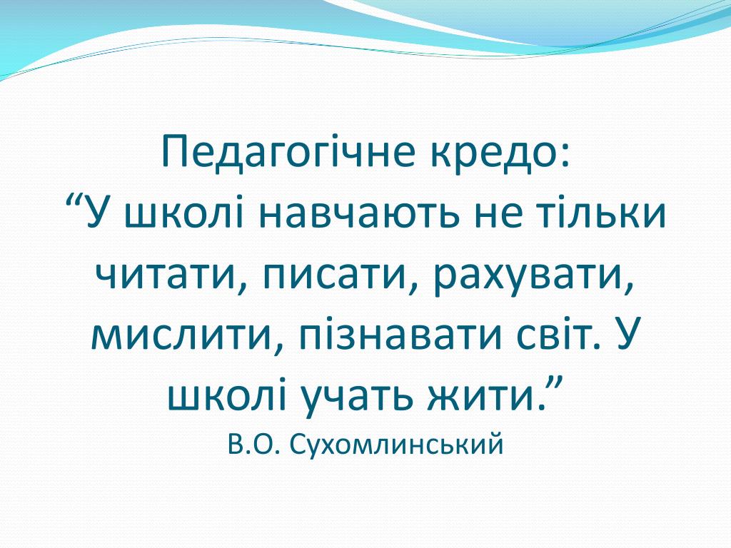 Педагогічне кредо:“У школі навчають не тільки читати, писати, рахувати, мислити, пізнавати світ. У школі учать жити.”В.О. Сухомлинський