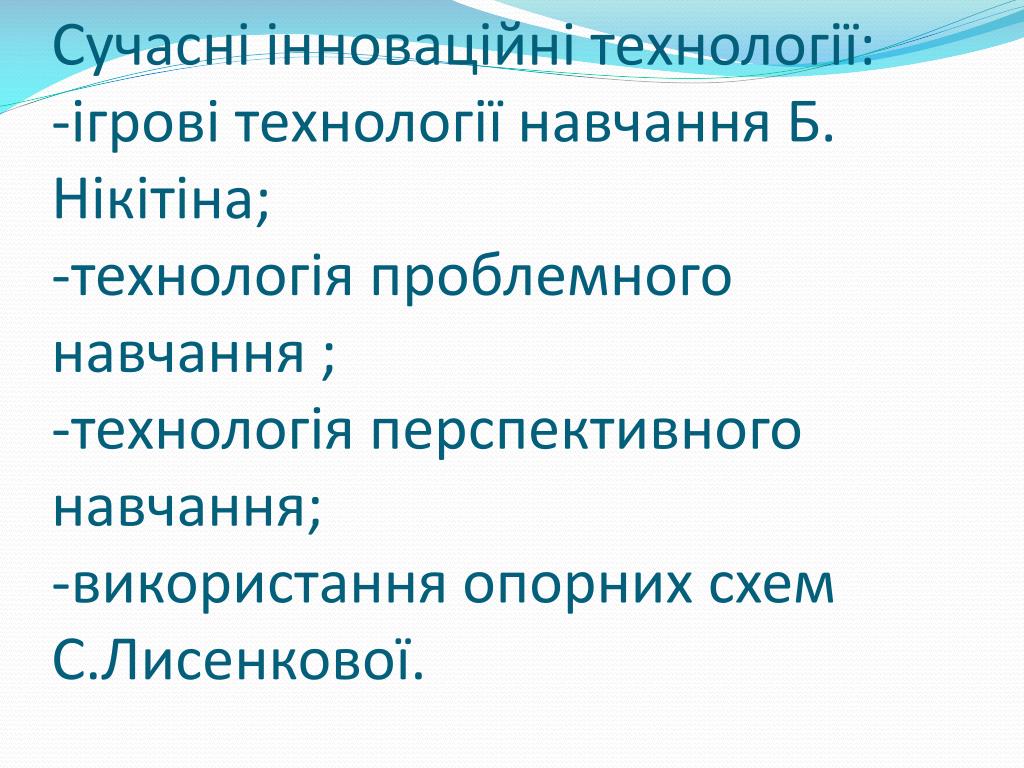 Сучасні інноваційні технології:-ігрові технології навчання Б. Нікітіна;-технологія проблемного навчання ;-технологія перспективного навчання;-використання опорних схем С.Лисенкової.