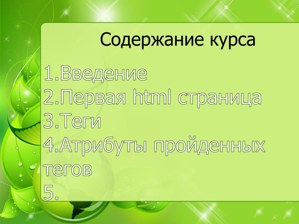 2. Содержание курса 1.Введение 2.Первая html страница 3.Теги 4.Атрибуты пройденных тегов 5.