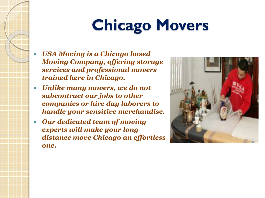 Chicago Movers • USA Moving is a Chicago based Moving Company, offering storage services and professional movers trained here in Chicago. • Unlike many movers, we do not subcontract our jobs to other companies or hire day laborers to handle your sensitive merchandise. • Our dedicated team of moving experts will make your long distance move Chicago an effortless one.