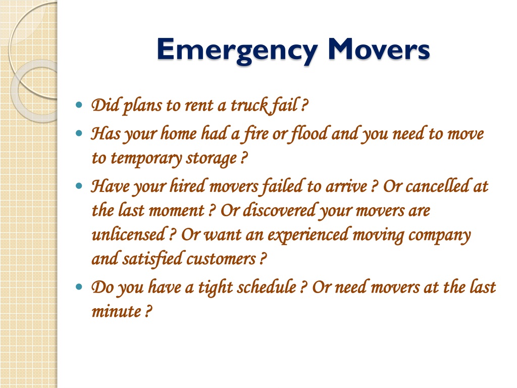 Emergency Movers • Did plans to rent a truck fail ? • Has your home had a fire or flood and you need to move to temporary storage ? • Have your hired movers failed to arrive ? Or cancelled at the last moment ? Or discovered your movers are unlicensed ? Or want an experienced moving company and satisfied customers ? • Do you have a tight schedule ? Or need movers at the last minute ?