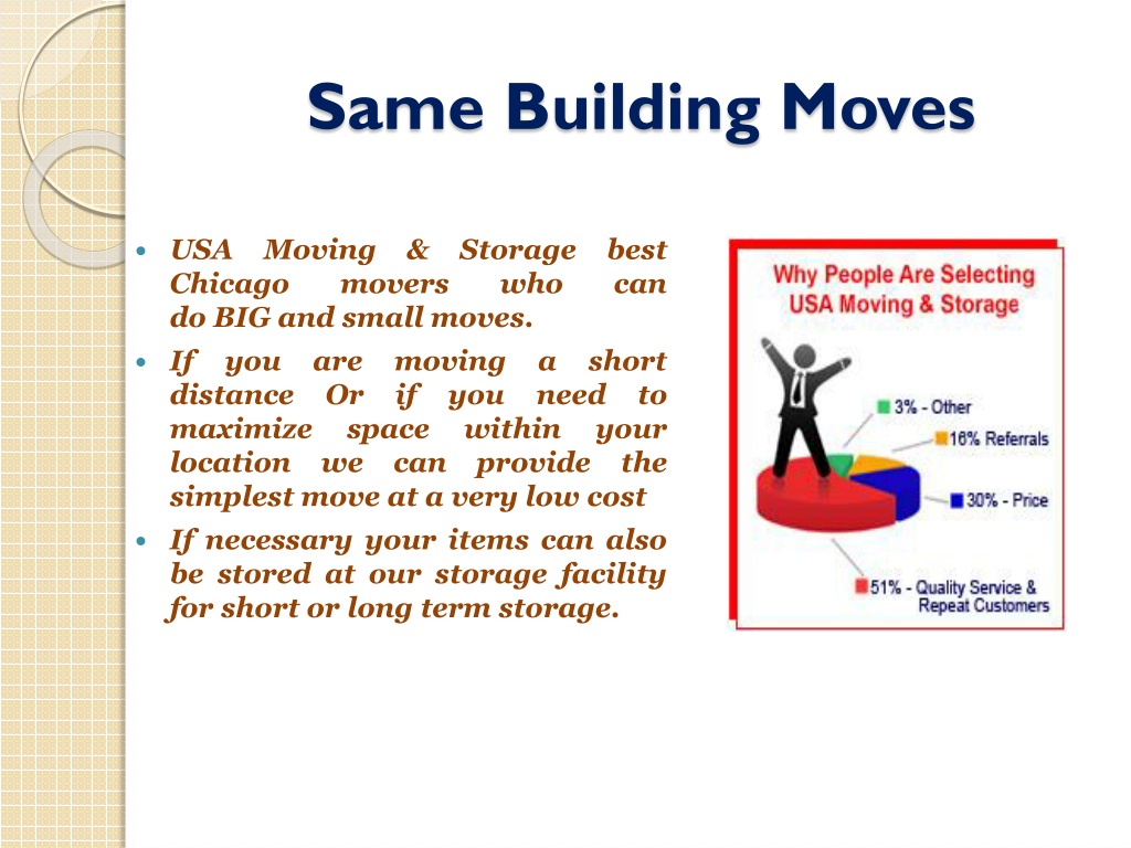 Same Building Moves • USA Moving & Storage best Chicago movers who can do BIG and small moves. • If you are moving a short distance Or if you need to maximize space within your location we can provide the simplest move at a very low cost • If necessary your items can also be stored at our storage facility for short or long term storage.
