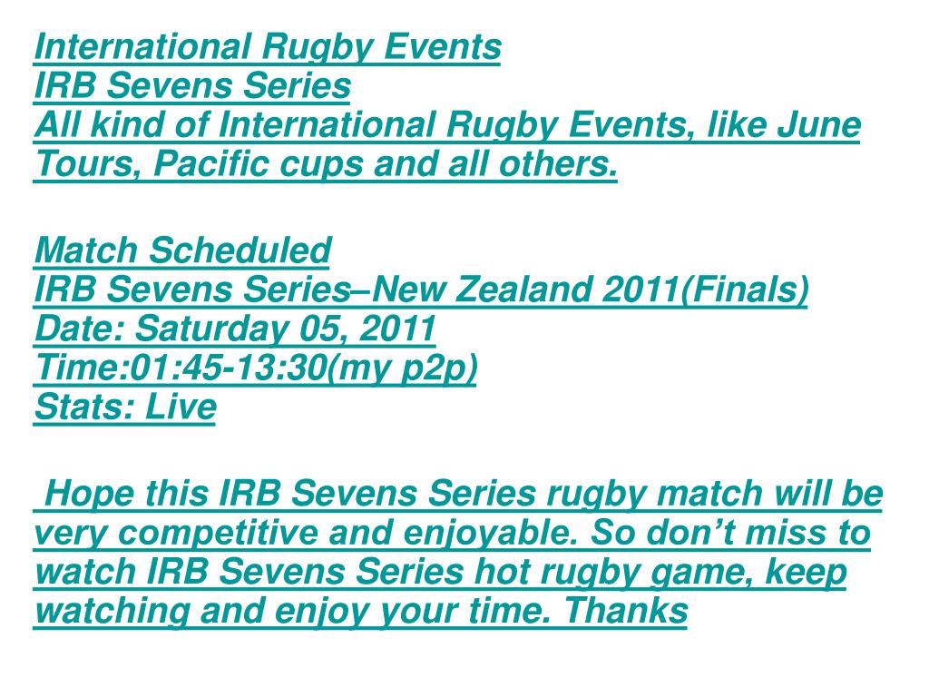 International Rugby EventsIRB Sevens SeriesAll kind of International Rugby Events, like June Tours, Pacific cups and all others. Match ScheduledIRB Sevens Series–New Zealand 2011(Finals)Date: Saturday 05, 2011Time:01:45-13:30(my p2p)Stats: Live Hope this IRB Sevens Series rugby match will be very competitive and enjoyable. So don’t miss to watch IRB Sevens Series hot rugby game, keep watching and enjoy your time. Thanks