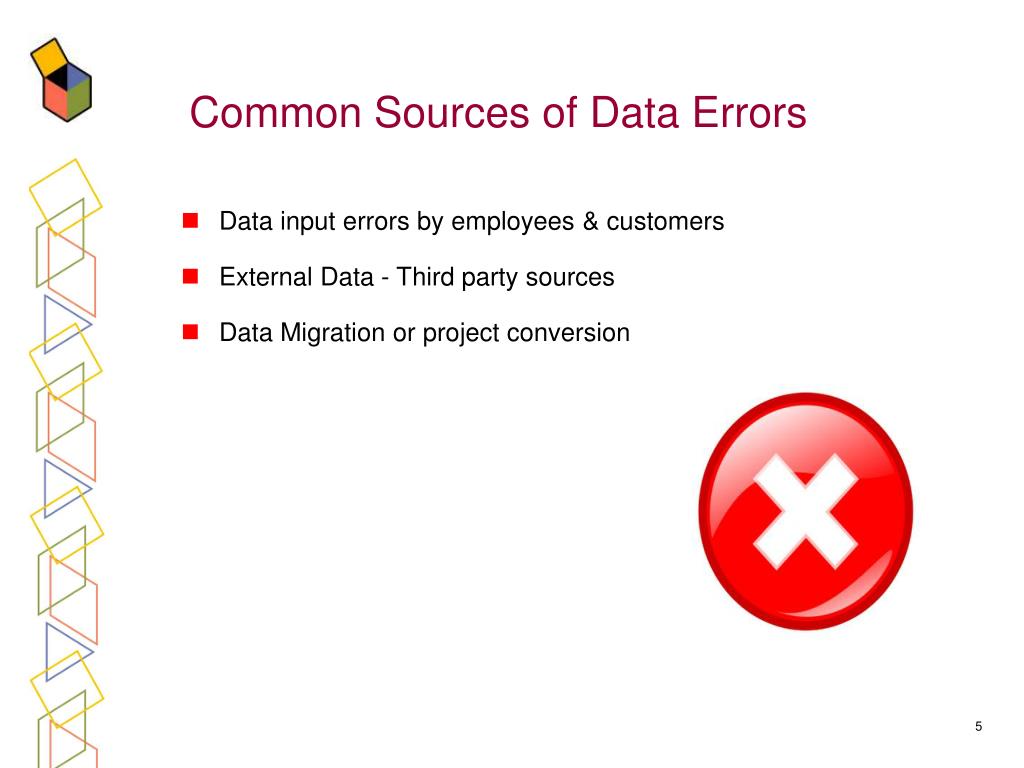 Common Sources of Data Errors Data input errors by employees & customers External Data - Third party sources Data Migration or project conversion