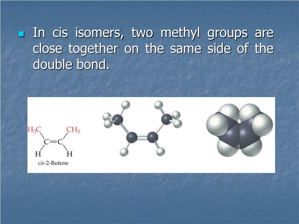 In cis isomers, two methyl groups are close together on the same side of the double bond.