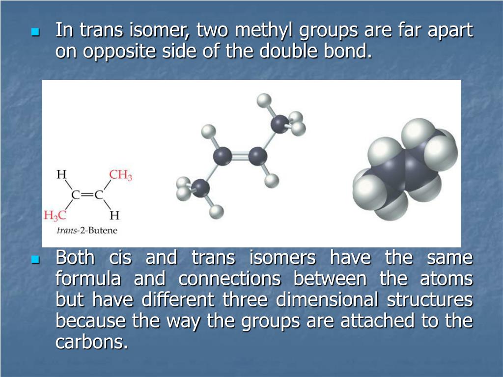 In trans isomer, two methyl groups are far apart on opposite side of the double bond. • Both cis and trans isomers have the same formula and connections between the atoms but have different three dimensional structures because the way the groups are attached to the carbons.
