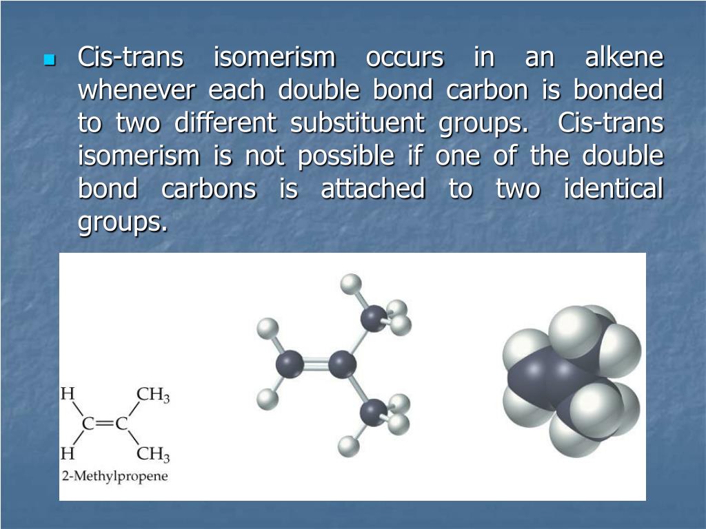 Cis-trans isomerism occurs in an alkene whenever each double bond carbon is bonded to two different substituent groups. Cis-trans isomerism is not possible if one of the double bond carbons is attached to two identical groups.