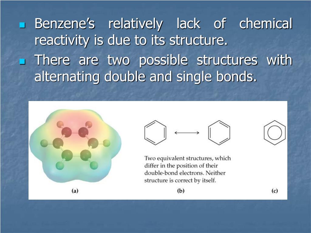 Benzene’s relatively lack of chemical reactivity is due to its structure. • There are two possible structures with alternating double and single bonds.