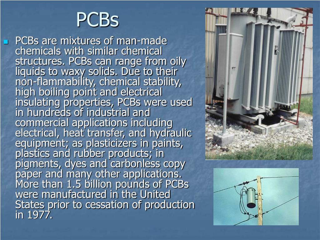 PCBs • PCBs are mixtures of man-made chemicals with similar chemical structures. PCBs can range from oily liquids to waxy solids. Due to their non-flammability, chemical stability, high boiling point and electrical insulating properties, PCBs were used in hundreds of industrial and commercial applications including electrical, heat transfer, and hydraulic equipment; as plasticizers in paints, plastics and rubber products; in pigments, dyes and carbonless copy paper and many other applications. More than 1.5 billion pounds of PCBs were manufactured in the United States prior to cessation of production in 1977.