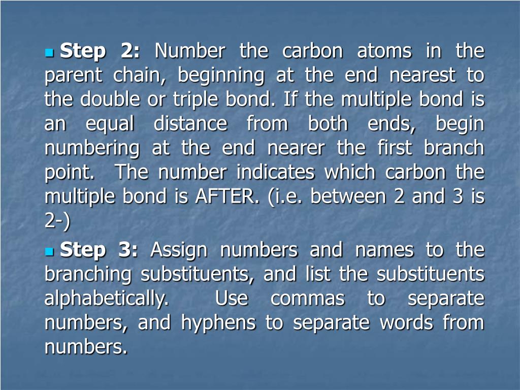 Step 2: Number the carbon atoms in the parent chain, beginning at the end nearest to the double or triple bond. If the multiple bond is an equal distance from both ends, begin numbering at the end nearer the first branch point. The number indicates which carbon the multiple bond is AFTER. (i.e. between 2 and 3 is 2-) • Step 3: Assign numbers and names to the branching substituents, and list the substituents alphabetically. Use commas to separate numbers, and hyphens to separate words from numbers.