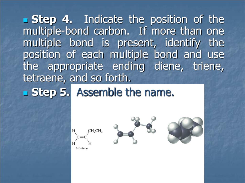 Step 4. Indicate the position of the multiple-bond carbon. If more than one multiple bond is present, identify the position of each multiple bond and use the appropriate ending diene, triene, tetraene, and so forth. • Step 5. Assemble the name.