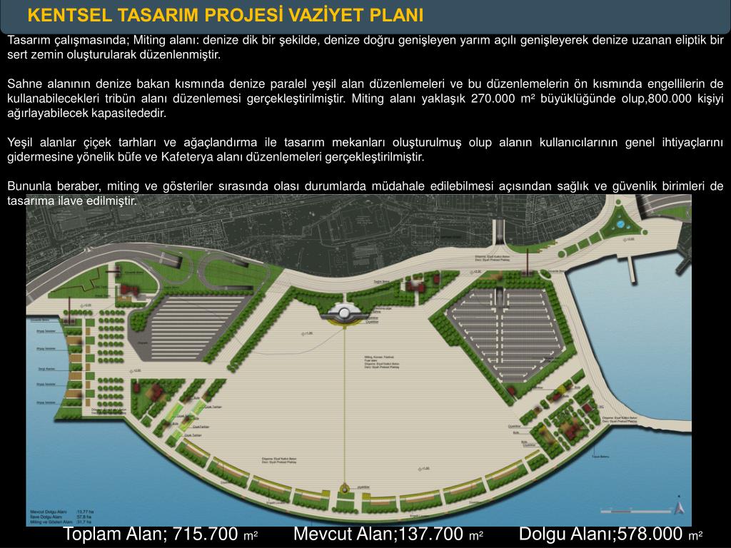 KENTSEL TASARIM PROJESİ VAZİYET PLANI Tasarım çalışmasında; Miting alanı: denize dik bir şekilde, denize doğru genişleyen yarım açılı genişleyerek denize uzanan eliptik bir sert zemin oluşturularak düzenlenmiştir. Sahne alanının denize bakan kısmında denize paralel yeşil alan düzenlemeleri ve bu düzenlemelerin ön kısmında engellilerin de kullanabilecekleri tribün alanı düzenlemesi gerçekleştirilmiştir. Miting alanı yaklaşık 270.000 m² büyüklüğünde olup,800.000 kişiyi ağırlayabilecek kapasitededir. Yeşil alanlar çiçek tarhları ve ağaçlandırma ile tasarım mekanları oluşturulmuş olup alanın kullanıcılarının genel ihtiyaçlarını gidermesine yönelik büfe ve Kafeterya alanı düzenlemeleri gerçekleştirilmiştir. Bununla beraber, miting ve gösteriler sırasında olası durumlarda müdahale edilebilmesi açısından sağlık ve güvenlik birimleri de tasarıma ilave edilmiştir. Toplam Alan; 715.700 m² Mevcut Alan;137.700 m² Dolgu Alanı;578.000 m²