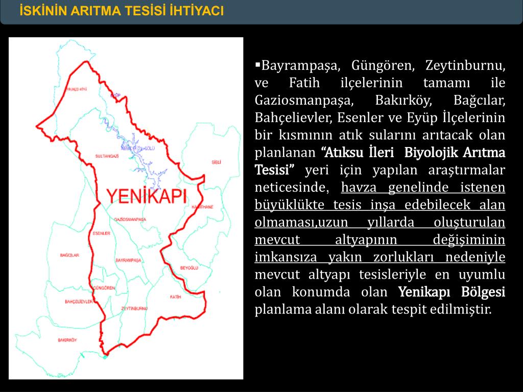 İSKİNİN ARITMA TESİSİ İHTİYACI • Bayrampaşa, Güngören, Zeytinburnu, ve Fatih ilçelerinin tamamı ile Gaziosmanpaşa, Bakırköy, Bağcılar, Bahçelievler, Esenler ve Eyüp İlçelerinin bir kısmının atıksularını arıtacak olan planlanan “Atıksu İleri Biyolojik Arıtma Tesisi” yeri için yapılan araştırmalar neticesinde, havza genelinde istenen büyüklükte tesis inşa edebilecek alan olmaması,uzun yıllarda oluşturulan mevcut altyapının değişiminin imkansıza yakın zorlukları nedeniyle mevcut altyapı tesisleriyle en uyumlu olan konumda olan YenikapıBölgesi planlama alanı olaraktespit edilmiştir.