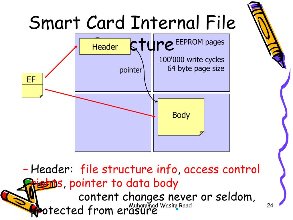EEPROM pages100'000 write cycles64 byte page size Header pointer EF Body Smart Card Internal File Structure • Header: file structure info, access control rights, pointer to data body content changes never or seldom, protected from erasure • Body: data, content might change often, many write operations Muhammad Wasim Raad