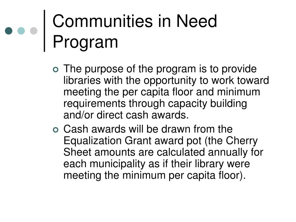 Communities in Need Program • The purpose of the program is to provide libraries with the opportunity to work toward meeting the per capita floor and minimum requirements through capacity building and/or direct cash awards. • Cash awards will be drawn from the Equalization Grant award pot (the Cherry Sheet amounts are calculated annually for each municipality as if their library were meeting the minimum per capita floor).