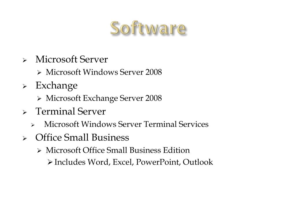 Software • Microsoft Server • Microsoft Windows Server 2008 • Exchange • Microsoft Exchange Server 2008 • Terminal Server • Microsoft Windows Server Terminal Services • Office Small Business • Microsoft Office Small Business Edition • Includes Word, Excel, PowerPoint, Outlook
