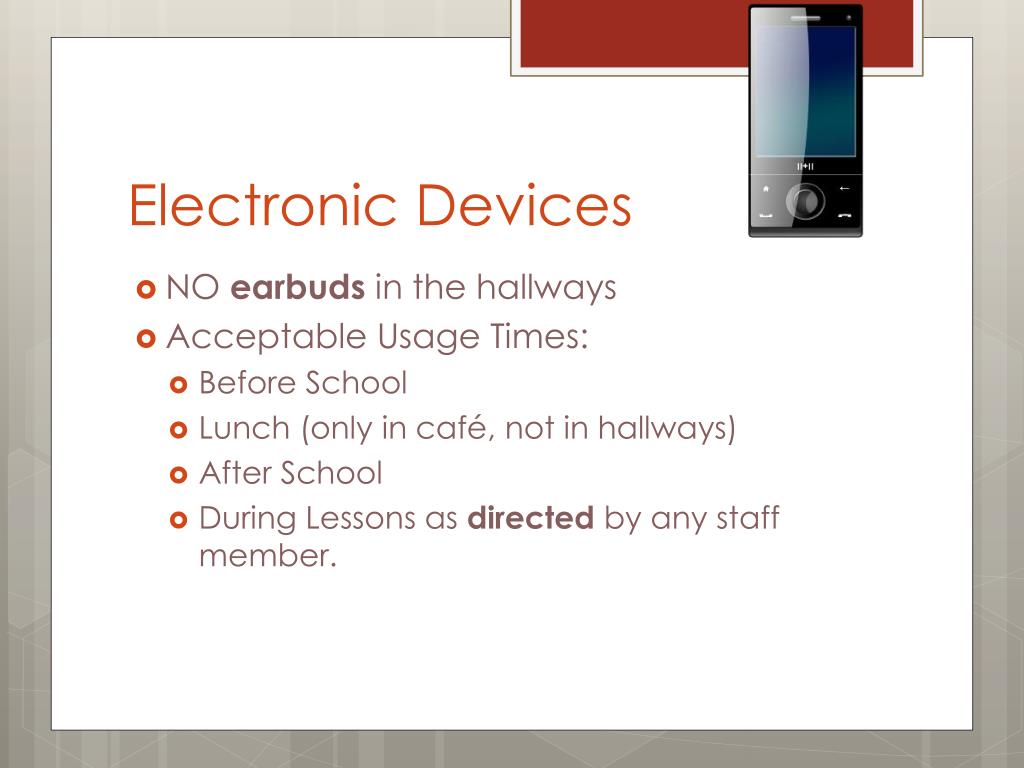 Electronic Devices • NO earbuds in the hallways • Acceptable Usage Times: • Before School • Lunch (only in café, not in hallways) • After School • During Lessons as directed by any staff member.