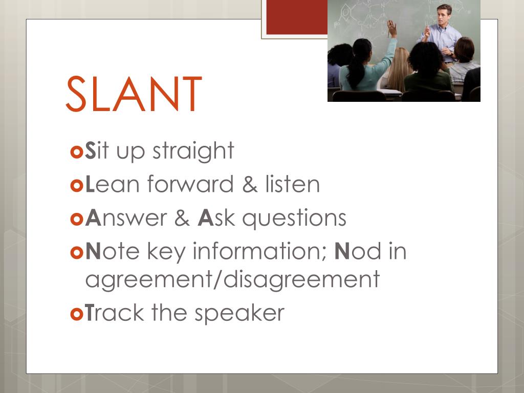 SLANT • Sit up straight • Lean forward & listen • Answer & Ask questions • Note key information; Nod in agreement/disagreement • Track the speaker