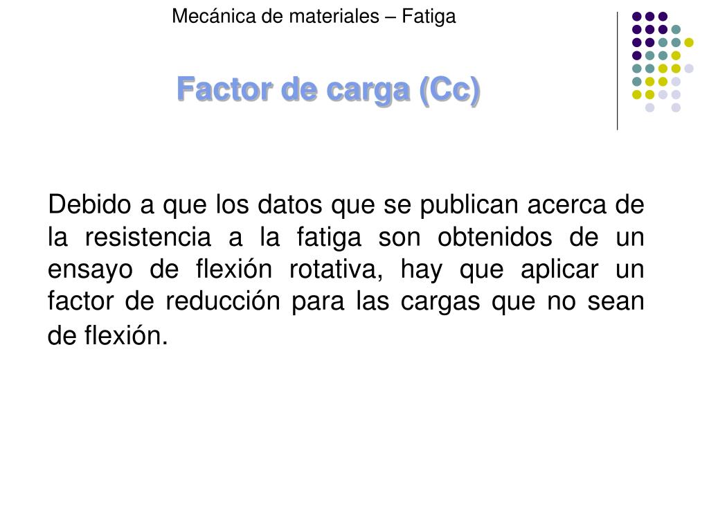 Mecánica de materiales – Fatiga Factor de carga (Cc) Debido a que los datos que se publican acerca de la resistencia a la fatiga son obtenidos de un ensayo de flexión rotativa, hay que aplicar un factor de reducción para las cargas que no sean de flexión.