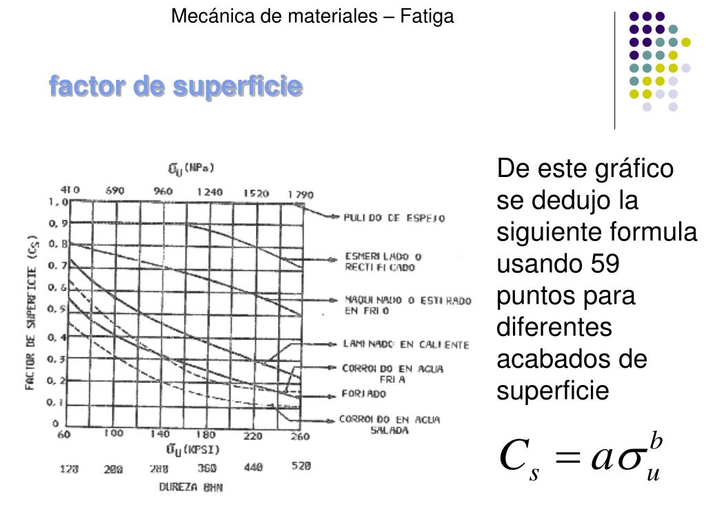 Mecánica de materiales – Fatiga factor de superficie De este gráfico se dedujo la siguiente formula usando 59 puntos para diferentes acabados de superficie