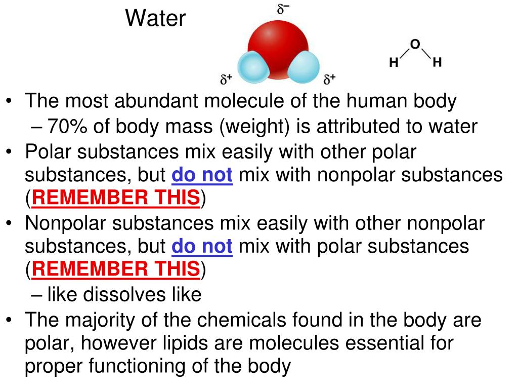 Water • The most abundant molecule of the human body • 70% of body mass (weight) is attributed to water • Polar substances mix easily with other polar substances, but do not mix with nonpolar substances (REMEMBER THIS) • Nonpolar substances mix easily with other nonpolar substances, but do not mix with polar substances (REMEMBER THIS) • like dissolves like • The majority of the chemicals found in the body are polar, however lipids are molecules essential for proper functioning of the body