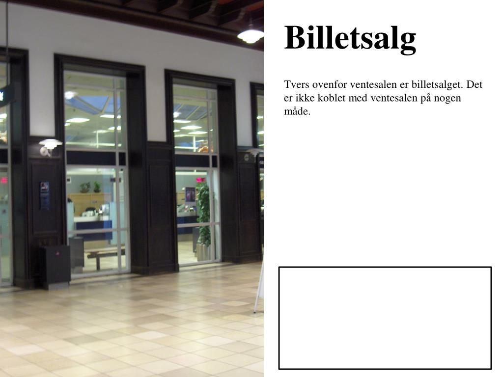 Billetsalg Tvers ovenfor ventesalen er billetsalget. Det er ikke koblet med ventesalen på nogen måde.