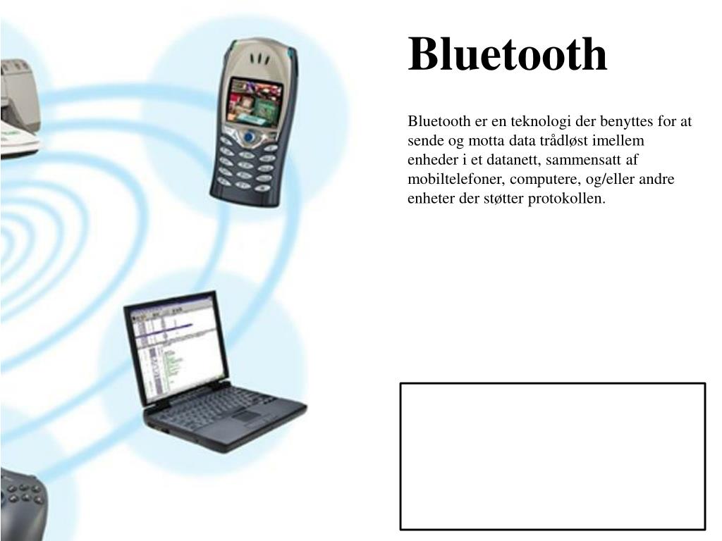 Bluetooth Bluetooth er en teknologi der benyttes for at sende og motta data trådløst imellem enheder i et datanett, sammensatt af mobiltelefoner, computere, og/eller andre enheter der støtter protokollen.