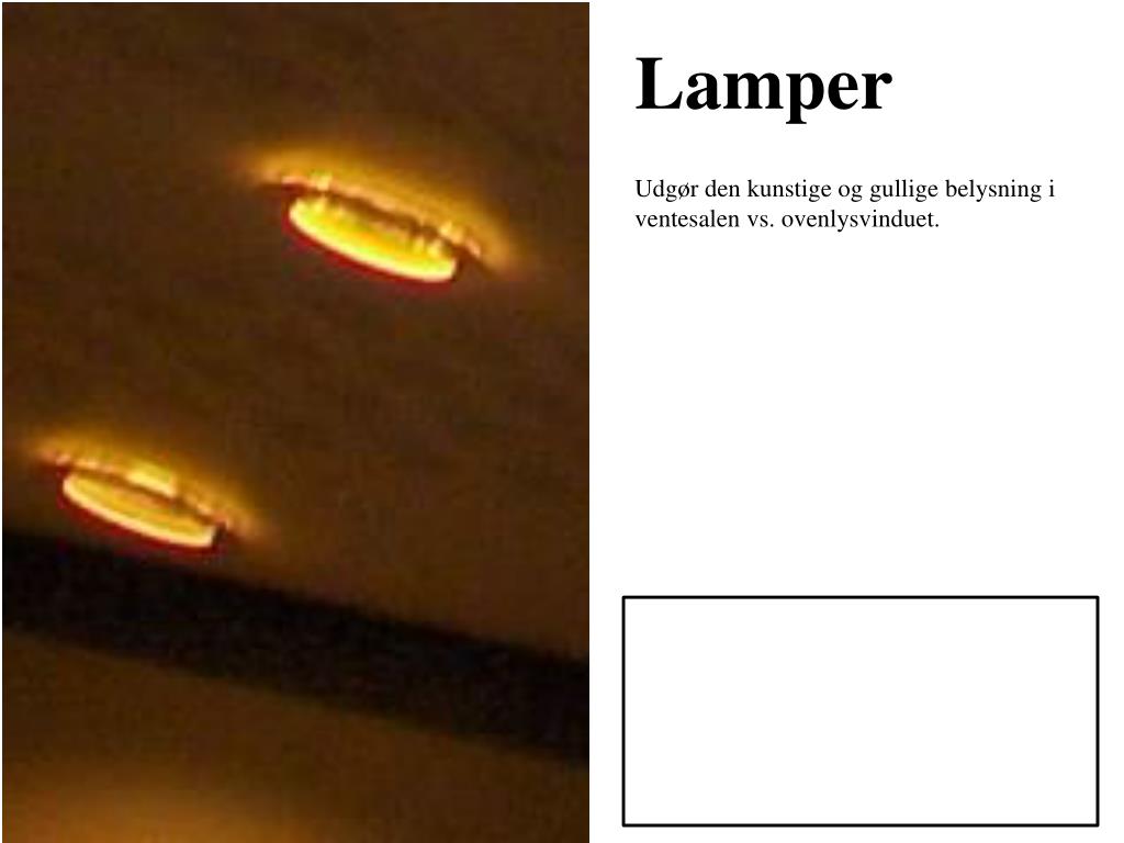 Lamper Udgør den kunstige og gullige belysning i ventesalen vs. ovenlysvinduet.
