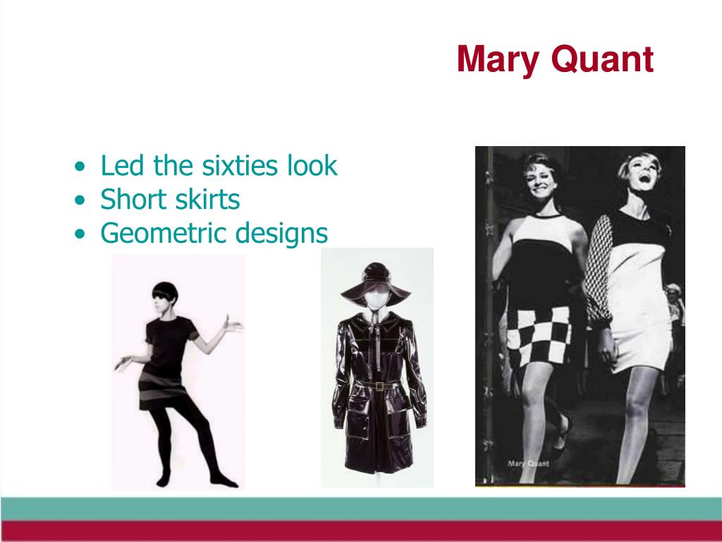 Mary Quant • Led the sixties look • Short skirts • Geometric designs