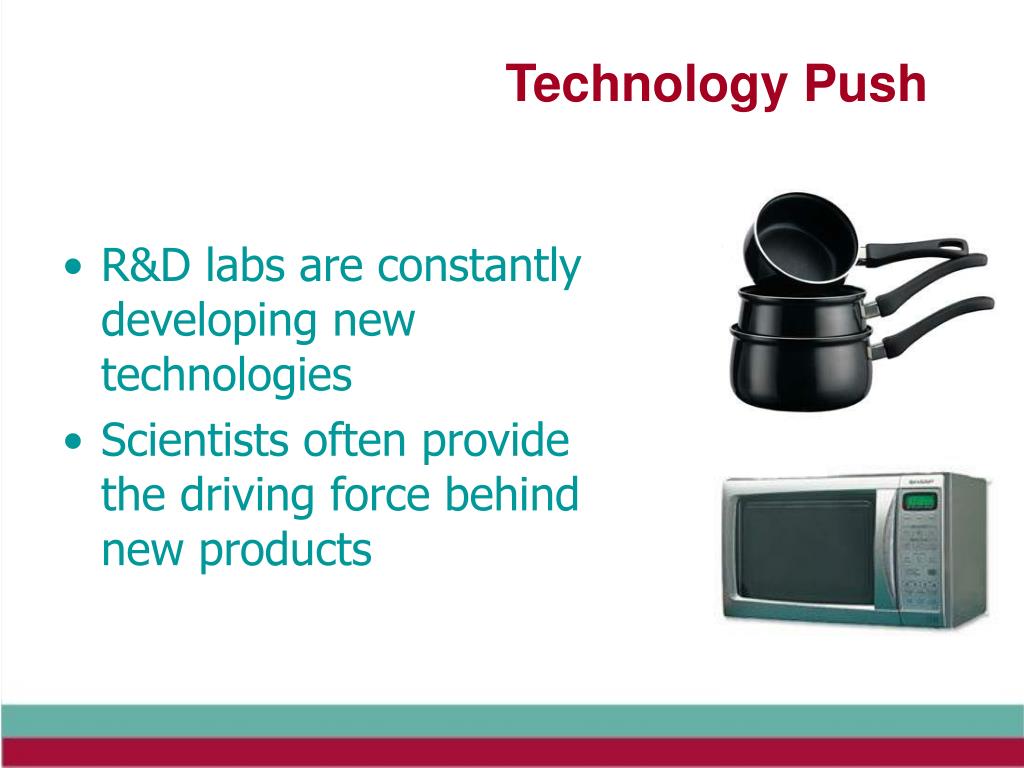 Technology Push • R&D labs are constantly developing new technologies • Scientists often provide the driving force behind new products