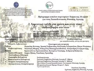 ΕΛΛΗΝΙΚΗ ΔΗΜΟΚΡΑΤΙΑΥΠΟΥΡΓΕΙΟ ΠΑΙΔΕΙΑΣ ΚΑΙ ΘΡΗΣΚΕΥΜΑΤΩΝ ΠΕΡΙΦΕΡΕΙΑΚΗ ΔΙΕΥΘΥΝΣΗ ΠΡΩΤΟΒΑΘΜΙΑΣ ΚΑΙ ΔΕΥΤΕΡΟΒΑΘΜΙΑΣ ΕΚΠΑΙΔΕΥΣΗΣ ΑΤΤΙΚΗΣ ΓΡΑΦΕΙΟ ΣΧΟΛΙΚΩΝ ΣΥΜΒΟΥΛΩΝ Δ.Ε. Β΄ ΑΘΗΝΑΣ ΣΧΟΛΙΚΟΣ ΣΥΜΒΟΥΛΟΣ ΦΥΣΙΚΗΣ ΑΓΩΓΗΣ ΠΑΝΕΛΛΗΝΙΑ ΕΝΩΣΗ ΕΚΠΑΙΔΕΥΤΙΚΩΝ ΛΕΙΤΟΥΡΓΩΝ ΦΥΣΙΚΗΣ ΑΓΩΓΗΣ Πρόγραμμα κύκλου σεμιναρίων διάρκειας 14 ωρών για τους Εκπαιδευτικούς Φυσικής Αγωγής 2. Χορευτικό ταξίδι στο χρόνο και στον τόπο: από το βορρά στο νότο ΔΕ: Τρίτη, 10/Δεκεμβρίου 2013 ΠΕ: Τρίτη, 17/ Δεκεμβρίου2013 Ίδρυμα Πέτρου Γ. Ζήση,Κολοκοτρώνη 5, Πλατεία Δούρου, Χαλάνδρι • 12.00-12.10 Εγγραφές • Πρόγραμμα • 12.10-14.00 Χοροί Στερεάς Ελλάδας: • Καγκέλι Λιβανατέικο • Εύβοια • Καβοντορίτικος • Αττική • Τράτα (Μέγαρα) • Λουλουβίκος (Μέγαρα) • Πασούμια (Σαλαμίνα) • Κούνα-κούνα (Σαλαμίνα) • Νταρσά (Ασπρόπυργος) • Αποκριάτικος (Ασπρόπυργος) Ελεύθερη συμμετοχή για εκπαιδευτικούς, γονείς και φοιτητές Επιστημονική επιτροπή: Περικλής Κώτσης, Χρυσή Στιβακτάκη, Καλλιόπη Γαλοπούλου, Βάγια Ντούσκα,Νικόλαος Θωμάς,Ευάγγελος Παπαχριστοδούλου, Αλέξανδρος Γεωργαντζής, Κρυσταλένια Χριστοπούλου, Κατερίνα Τσιούφη,Ανδριανή Βούξινου, Σοφία Μάκη,Νικόλαος Τριπόδης Συνδιοργάνωση: Σχολικός Σύμβουλος Φυσικής Αγωγής Β΄ Αθήνας Σχολική Σύμβουλος Φυσικής Αγωγής Α’ Αθήνας* Πανελλήνια Ένωση Εκπαιδευτικών Λειτουργών Φυσικής Αγωγής Eθνομουσικολογικό Ίδρυμα ΠέτρουΓ. Ζήση *Σχολεία αρμοδιότητας Νικόλαος Τριπόδης Σχολικός Σύμβουλος Φυσικής Αγωγής