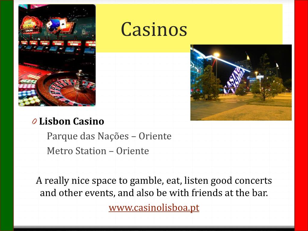 Casinos • Lisbon Casino Parque das Nações – Oriente Metro Station – Oriente A reallynicespace to gamble, eat, listengoodconcertsandotherevents, andalsobewithfriendsatthe bar. www.casinolisboa.pt