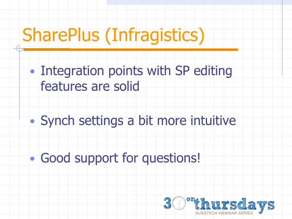 SharePlus (Infragistics) • Integration points with SP editing features are solid • Synch settings a bit more intuitive • Good support for questions!