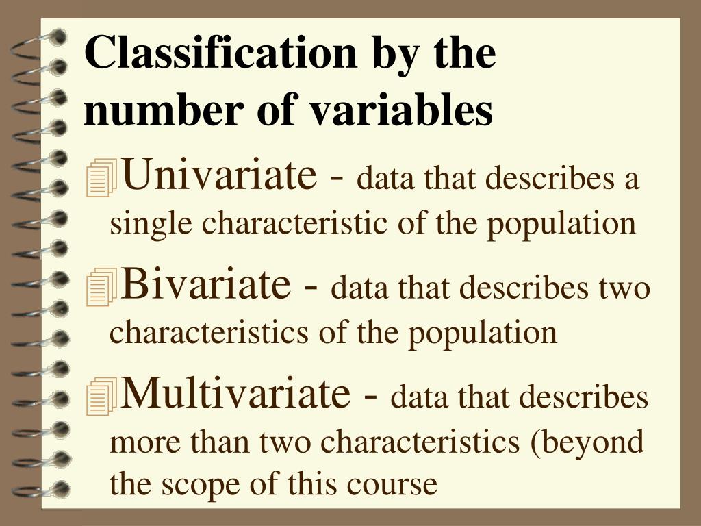 Classification by the number of variables • Univariate - data that describes a single characteristic of the population • Bivariate - data that describes two characteristics of the population • Multivariate - data that describes more than two characteristics (beyond the scope of this course