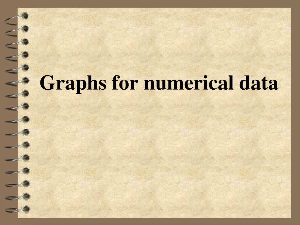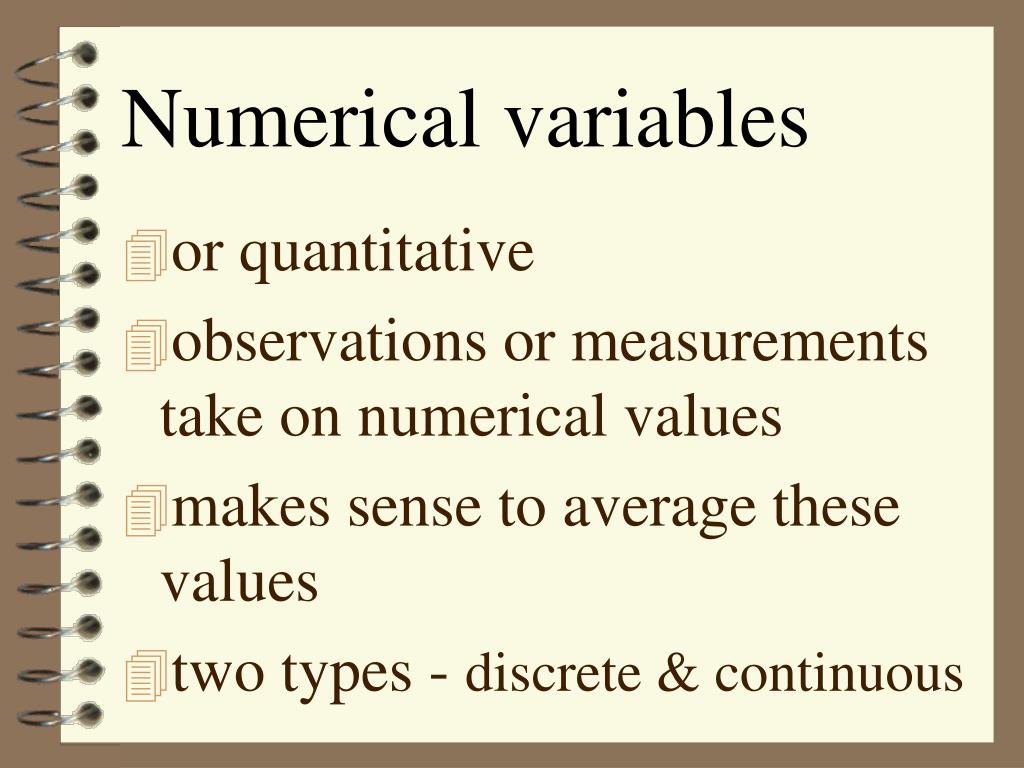 Numerical variables • or quantitative • observations or measurements take on numerical values • makes sense to average these values • two types - discrete & continuous