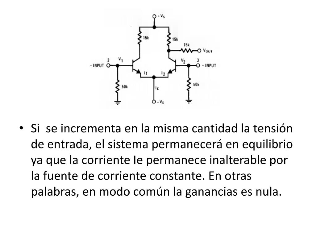 Si se incrementa en la misma cantidad la tensión de entrada, el sistema permanecerá en equilibrio ya que la corriente Ie permanece inalterable por la fuente de corriente constante. En otras palabras, en modo común la ganancias es nula.